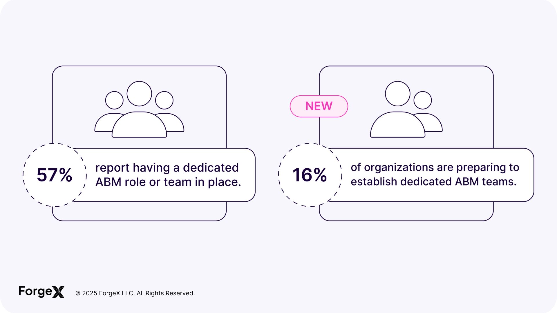 When it comes to properly investing in headcount to lead the ABM program, we found that 57% of organizations have a dedicated role or team in place.